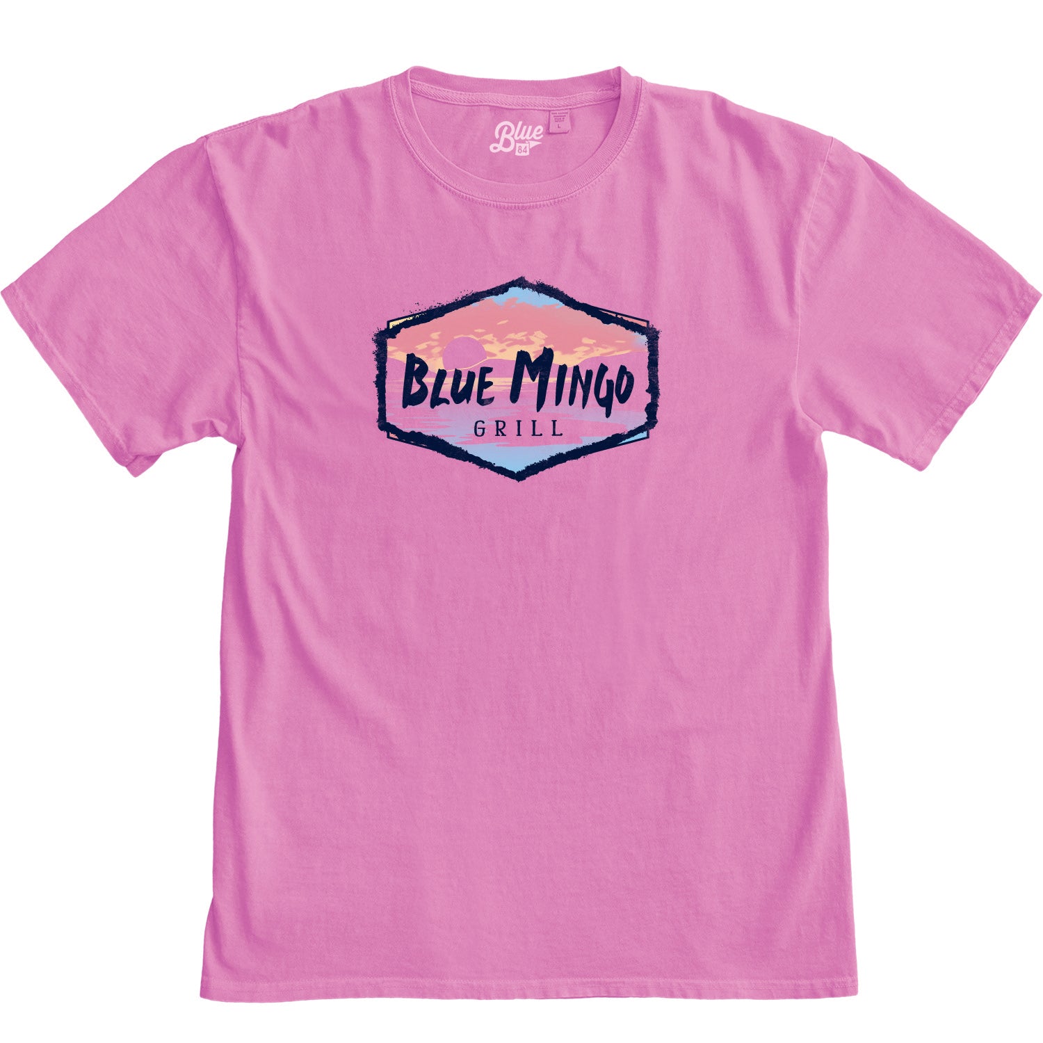 Stand out with our vibrant Blue Mingo Grill T-Shirt! This eye-catching tee in the color Wild Orchid features a bold hexagonal design on the front, showcasing a colorful sunset backdrop with the view of the mountains from the Blue Mingo Grill. Perfect for fans of the restaurant or those who appreciate a unique look. This dyed ringspun short-sleeve shirt is made from 100% cotton, it offers a comfortable fit and a playful vibe. Available in sizes small through 2XL, it fits a wide variety of body types. Grab yours today and add some flair to your wardrobe!