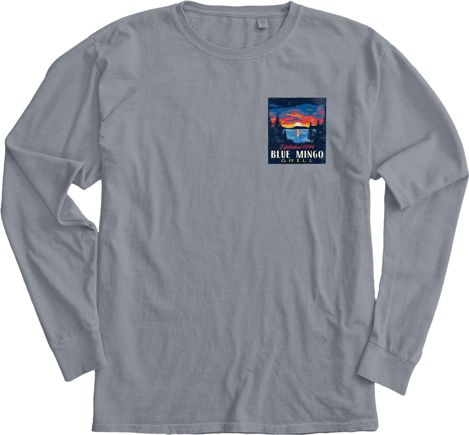 This stylish longsleeve t-shirt comes in a Steel Gray color, perfect for a casual yet eye-catching look. The back showcases an artistic design of a sunset over Otsego Lake, with the mountain view from the Blue Mingo Grill. While the front has the same design but smaller, displayed on the front left chest. This design is so popular you can find it on a short sleeve or full zip as well as a sticker or magnet! This dyed ringspun tee is made from 100% cotton. Available in sizes small through 2XL, it fits a wide variety of body types.