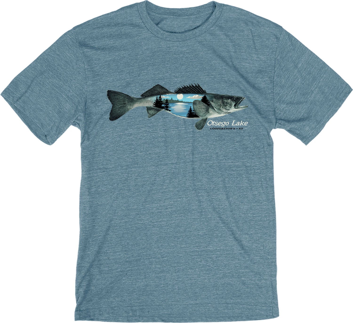 This stylish t-shirt features a triblend fabric in the colors Glacier and Forest, perfect for a laid-back yet nature-inspired look. The front showcases a striking design of a walleye fish with a scenic view of Otsego Lake at dusk or dawn visible through its body, complete with silhouetted trees and a moonlit sky. The text “Otsego Lake Cooperstown, NY” adds a local touch. Made from 50% polyester, 37% cotton and. 13% rayon making it a soft, comfortable material. Available in sizes small though 2XL, it fits a wide variety of body types. This t-shirt is ideal for outdoor enthusiasts, especially people who fish, who would love its unique, artistic appeal.