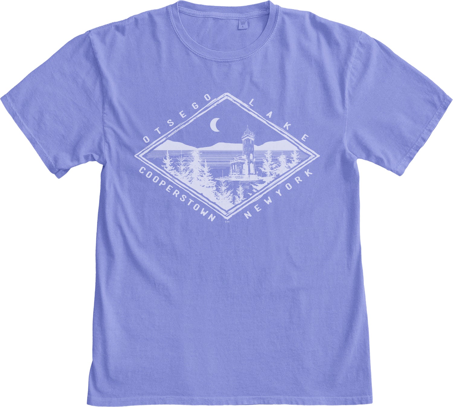 This dyed ringspun tee is made from 100% cotton and available in vibrant colors: peri and boysenberry. This customer favorite features a stunning design of Kingfisher Tower as seen from the Blue Mingo Grill, capturing the beauty of the view on the front of the shirt, while the back remains blank for a sleek look. Perfect for casual outings or relaxing days, this tee combines comfort with a touch of local charm. Available in sizes small through 2XL, it fits a range of body types perfectly.